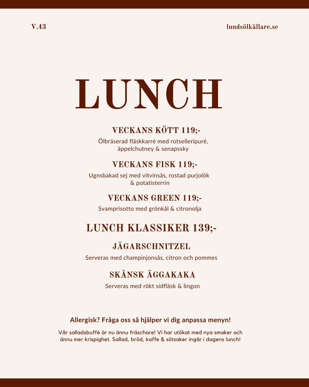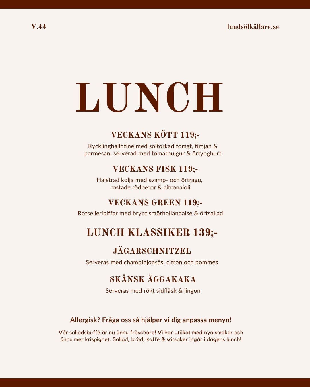 God och prisvärd lunch. Fint salladsbord med hembakat bröd. Kaffe och en härligt kladdig chokladkaka ingick i priset. Mysig miljö och mycket trevligt och tillmötesgående personal.